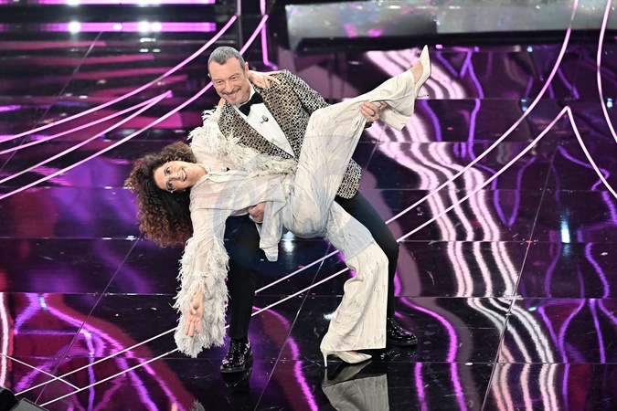 Teresa Mannino, Amadeus during Sanremo Italian Song Festival. Sanremo, Italy, 08 February 2024., Credit:Maria Laura Antonelli / Avalon