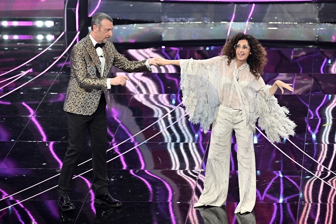 Teresa Mannino, Amadeus during Sanremo Italian Song Festival. Sanremo, Italy, 08 February 2024., Credit:Maria Laura Antonelli / Avalon