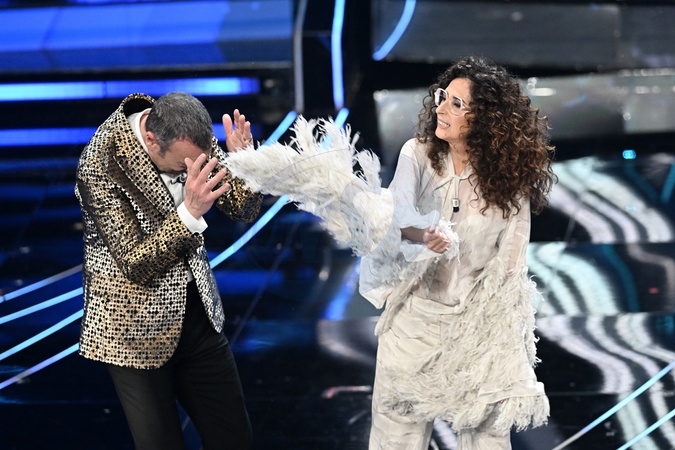 Teresa Mannino, Amadeus during Sanremo Italian Song Festival. Sanremo, Italy, 08 February 2024., Credit:Maria Laura Antonelli / Avalon