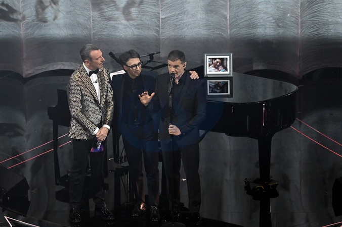 Amadeus, Stefano Massini, Paolo Jannacci during Sanremo Italian Song Festival. Sanremo, Italy, 08 February 2024., Credit:Maria Laura Antonelli / Avalon