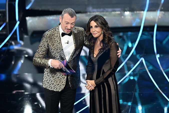 Amadeus, Sabrina Ferilli during Sanremo Italian Song Festival. Sanremo, Italy, 08 February 2024., Credit:Maria Laura Antonelli / Avalon