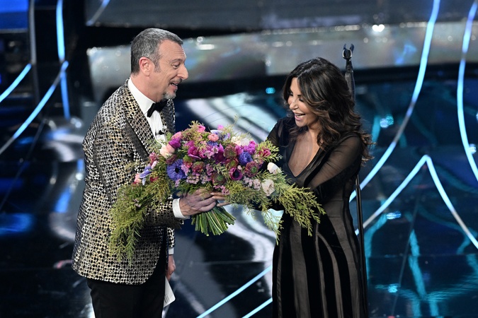 Amadeus, Sabrina Ferilli during Sanremo Italian Song Festival. Sanremo, Italy, 08 February 2024., Credit:Maria Laura Antonelli / Avalon