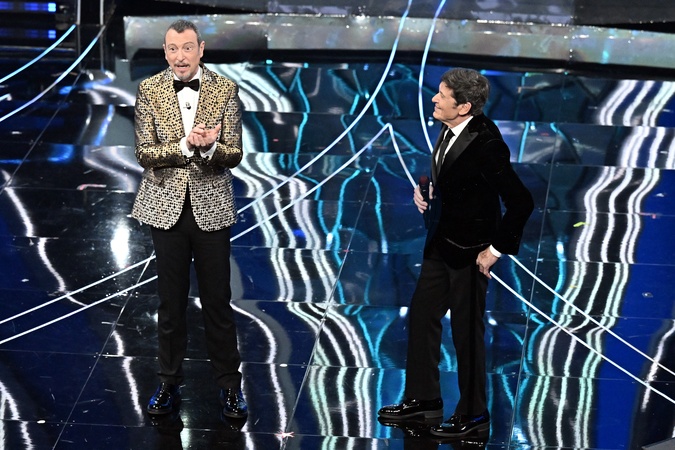 Gianni Morandi, Amadeus during Sanremo Italian Song Festival. Sanremo, Italy, 08 February 2024., Credit:Maria Laura Antonelli / Avalon