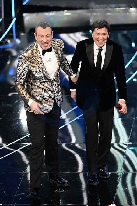 Gianni Morandi, Amadeus during Sanremo Italian Song Festival. Sanremo, Italy, 08 February 2024., Credit:Maria Laura Antonelli / Avalon