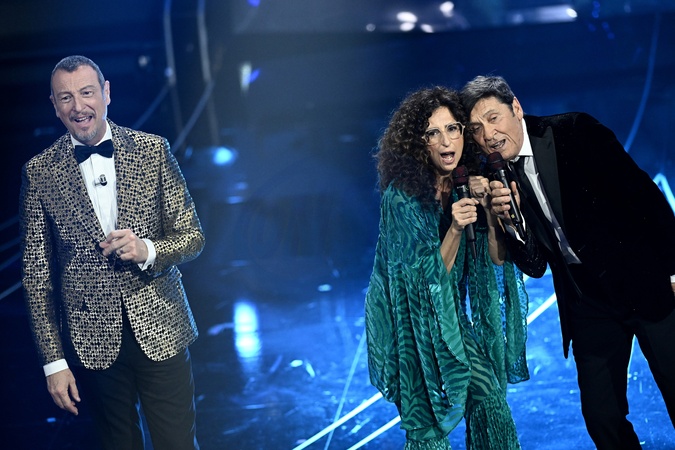 Gianni Morandi, Teresa Mannino, Amadeus during Sanremo Italian Song Festival. Sanremo, Italy, 08 February 2024., Credit:Maria Laura Antonelli / Avalon