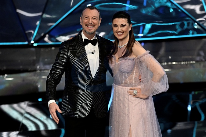 Giovanna Civitillo , Amadeus during the day 3 of 74th Sanremo Music Festival 2024, Italy - 08 Feb 2024, Credit:Maria Laura Antonelli / Avalon