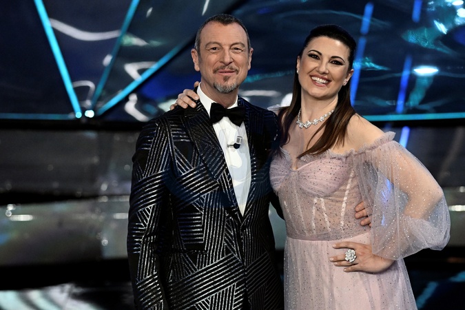 Giovanna Civitillo , Amadeus during the day 3 of 74th Sanremo Music Festival 2024, Italy - 08 Feb 2024, Credit:Maria Laura Antonelli / Avalon