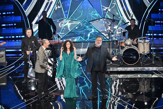Amadeus, Teresa Mannino, Russel Crowe during the day 3 of 74th Sanremo Music Festival 2024, Italy - 08 Feb 2024, Credit:Maria Laura Antonelli / Avalon