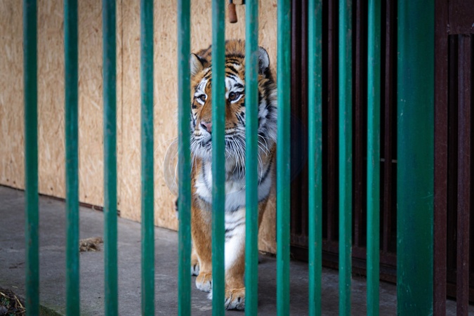 CHUBYNSKE, UKRAINE - FEBRUARY 8, 2024 - A tiger stays in an enclosure at the Wild Animals Rescue Center, Chubynske, Kyiv region, northern Ukraine., Credit:Kirill Chubotin / Avalon