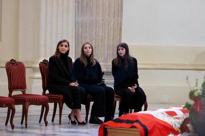 La princesse Clotilde Courau et ses filles les princesses Vittoria et Louisa - Veillée funèbre du prince Victor-Emmanuel de Savoie, en l'Eglise de Sant'Uberto à Turin, en présence de sa veuve Marina Ricolfi-Doria, de son fils, le prince E-P. de Savoie avec sa femme la princesse Clotilde Courau et leurs filles les princesses Vittoria et Louisa, le 9 février 2024. Le fils du dernier roi d'Italie s'est éteint le 3 février 2024 à l'âge de 86 ans. © Dominique Jacovides/Bestimage Funeral wake of Prince Victor-Emmanuel of Savoy, in the Church of Sant'Uberto in Turin, in the presence of his widow Marina Ricolfi-Doria, his son, Prince E-P. of Savoy with his wife Princess Clotilde Courau and their daughters Princesses Vittoria and Louisa, February 9, 2024. The son of the last king of Italy died on February 3, 2024 at the age of 86.