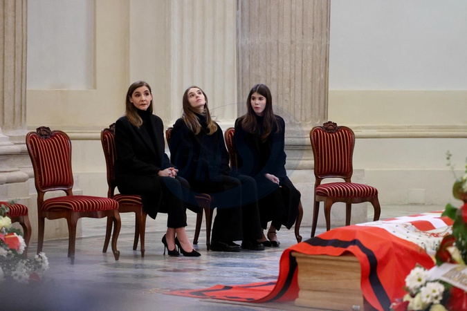 La princesse Clotilde Courau et ses filles les princesses Vittoria et Louisa - Veillée funèbre du prince Victor-Emmanuel de Savoie, en l'Eglise de Sant'Uberto à Turin, en présence de sa veuve Marina Ricolfi-Doria, de son fils, le prince E-P. de Savoie avec sa femme la princesse Clotilde Courau et leurs filles les princesses Vittoria et Louisa, le 9 février 2024. Le fils du dernier roi d'Italie s'est éteint le 3 février 2024 à l'âge de 86 ans. © Dominique Jacovides/Bestimage Funeral wake of Prince Victor-Emmanuel of Savoy, in the Church of Sant'Uberto in Turin, in the presence of his widow Marina Ricolfi-Doria, his son, Prince E-P. of Savoy with his wife Princess Clotilde Courau and their daughters Princesses Vittoria and Louisa, February 9, 2024. The son of the last king of Italy died on February 3, 2024 at the age of 86.