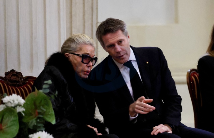 Marina Ricolfi-Doria et son fils, le prince Emmanuel-Philibert de Savoie - Veillée funèbre du prince Victor-Emmanuel de Savoie, en l'Eglise de Sant'Uberto à Turin, en présence de sa veuve Marina Ricolfi-Doria, de son fils, le prince E-P. de Savoie avec sa femme la princesse Clotilde Courau et leurs filles les princesses Vittoria et Louisa, le 9 février 2024. Le fils du dernier roi d'Italie s'est éteint le 3 février 2024 à l'âge de 86 ans. © Dominique Jacovides/Bestimage Funeral wake of Prince Victor-Emmanuel of Savoy, in the Church of Sant'Uberto in Turin, in the presence of his widow Marina Ricolfi-Doria, his son, Prince E-P. of Savoy with his wife Princess Clotilde Courau and their daughters Princesses Vittoria and Louisa, February 9, 2024. The son of the last king of Italy died on February 3, 2024 at the age of 86.