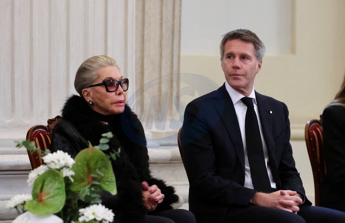 Marina Ricolfi-Doria et son fils, le prince Emmanuel-Philibert de Savoie - Veillée funèbre du prince Victor-Emmanuel de Savoie, en l'Eglise de Sant'Uberto à Turin, en présence de sa veuve Marina Ricolfi-Doria, de son fils, le prince E-P. de Savoie avec sa femme la princesse Clotilde Courau et leurs filles les princesses Vittoria et Louisa, le 9 février 2024. Le fils du dernier roi d'Italie s'est éteint le 3 février 2024 à l'âge de 86 ans. © Dominique Jacovides/Bestimage Funeral wake of Prince Victor-Emmanuel of Savoy, in the Church of Sant'Uberto in Turin, in the presence of his widow Marina Ricolfi-Doria, his son, Prince E-P. of Savoy with his wife Princess Clotilde Courau and their daughters Princesses Vittoria and Louisa, February 9, 2024. The son of the last king of Italy died on February 3, 2024 at the age of 86.