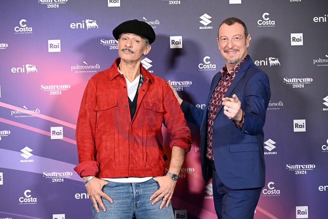 Amadeus, Rosario Fiorello during a photocall on the occasion of the 74th Sanremo Italian Song Festival, in Sanremo, Italy, 10 February 2024, Credit:Maria Laura Antonelli / Avalon