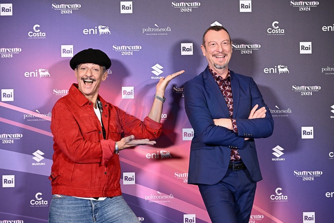 Amadeus and Rosario Fiorello during a photocall on the occasion of the 74th Sanremo Italian Song Festival, in Sanremo, Italy, 10 February 2024.