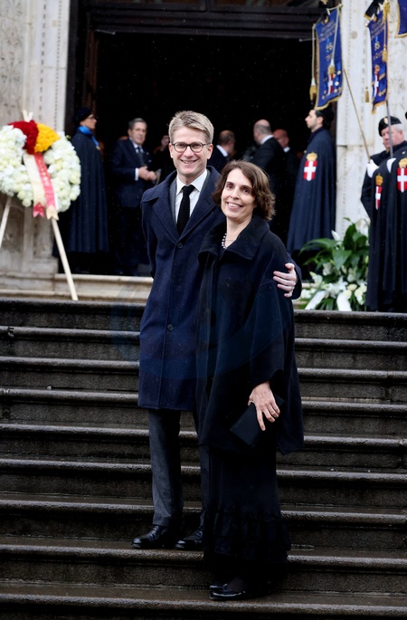 Le prince Charles-Louis d'Orléans et sa femme Iléana Manos - Les funérailles du prince Victor Emmanuel de Savoie, fils du dernier roi d'Italie, en la basilique de Superga, près de Turin, le 10 février 2004. © Dominique Jacovides/Bestimage The funeral of prince Victor Emmanuel of Savoy, son of the last king of Italy, in the basilica of Superga, near Turin, February 10, 2004.