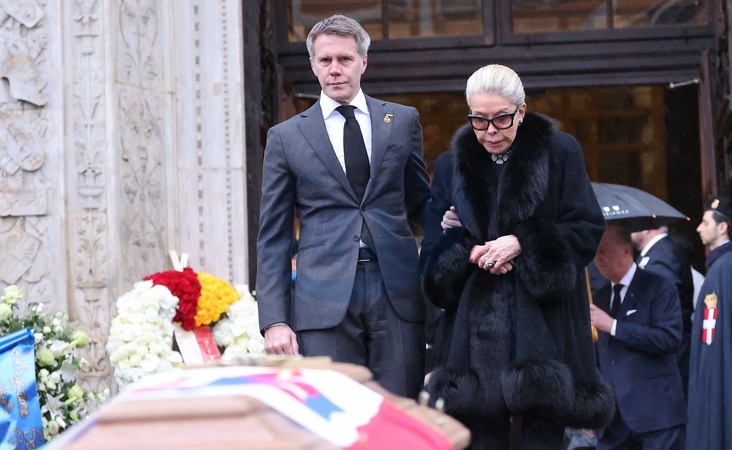Le prince Emmanuel-Philibert de Savoie et sa mère Marina Ricolfi-Doria - Sorties des funérailles du prince Victor Emmanuel de Savoie en la basilique de Superga près de Turin le 10 février 2024. © Dominique Jacovides/Bestimage Exits from the funeral of Prince Victor Emmanuel of Savoy at the Basilica of Superga near Turin on February 10, 2024.