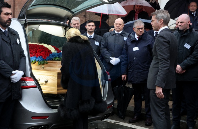 Le prince Emmanuel-Philibert de Savoie et sa mère Marina Ricolfi-Doria - Sorties des funérailles du prince Victor Emmanuel de Savoie en la basilique de Superga près de Turin le 10 février 2024. © Dominique Jacovides/Bestimage Exits from the funeral of Prince Victor Emmanuel of Savoy at the Basilica of Superga near Turin on February 10, 2024.