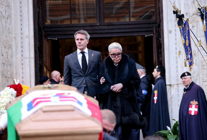 Le prince Emmanuel-Philibert de Savoie et sa mère Marina Ricolfi-Doria - Sorties des funérailles du prince Victor Emmanuel de Savoie en la basilique de Superga près de Turin le 10 février 2024. © Dominique Jacovides/Bestimage Exits from the funeral of Prince Victor Emmanuel of Savoy at the Basilica of Superga near Turin on February 10, 2024.