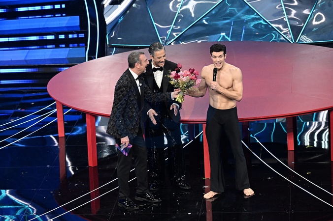 Roberto Bolle, Amadeus, Fiorello during the day 5 of 74th Sanremo Music Festival 2024, Italy - 10 Feb 2024, Credit:Maria Laura Antonelli / Avalon