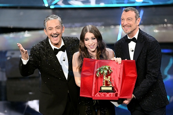 Amadeus, Fiorello, and Angelina Mango, winner of the Sanremo festival during the day 5 of 74th Sanremo Music Festival 2024, Italy - 10 Feb 2024, Credit:Maria Laura Antonelli / Avalon