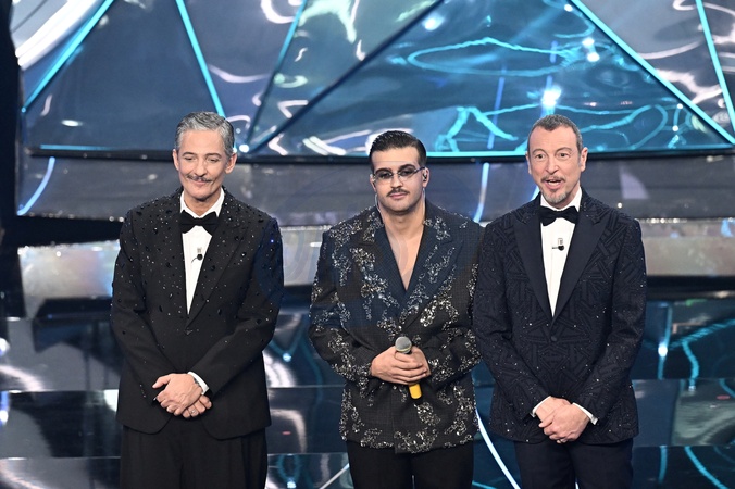 Geolier, Amadeus, Fiorello during the day 5 of 74th Sanremo Music Festival 2024, Italy - 10 Feb 2024, Credit:Maria Laura Antonelli / Avalon
