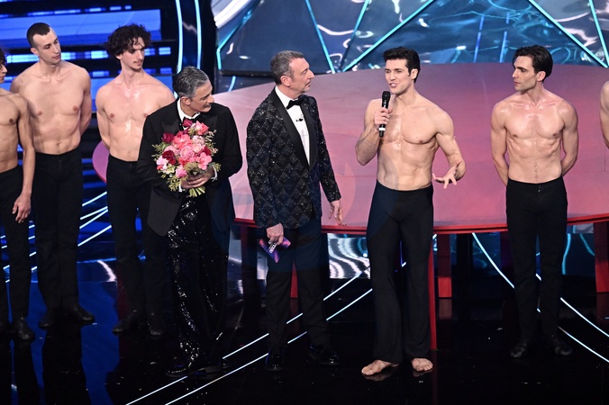 Roberto Bolle, Amadeus, Fiorello during the day 5 of 74th Sanremo Music Festival 2024, Italy - 10 Feb 2024, Credit:Maria Laura Antonelli / Avalon