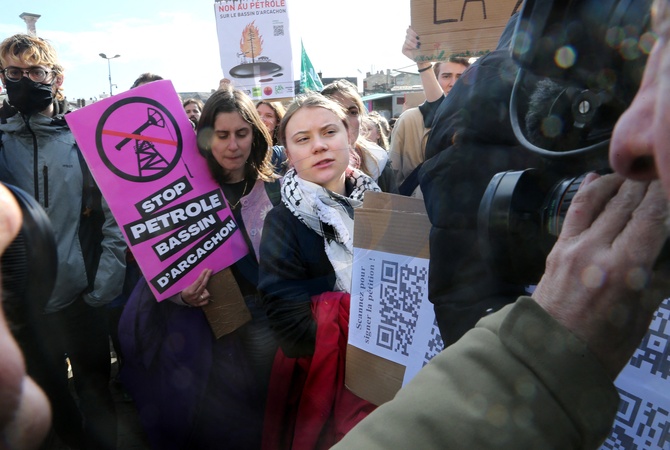Greta Thunberg bierze udział w demonstracji przeciwko projektowi wiercenia ośmiu szybów naftowych w lesie La Teste w dorzeczu Arcachon