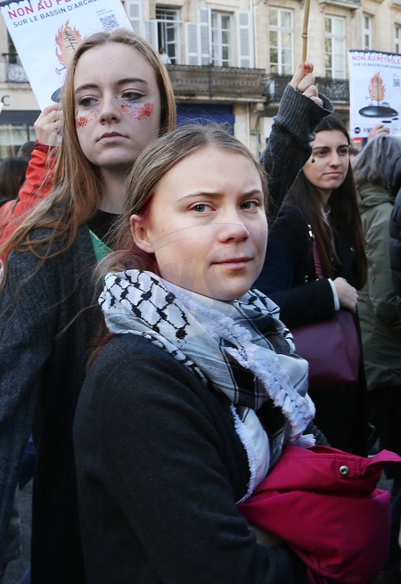 Greta Thunberg, symbol mondial de la lutte contre le rechauffement climatique participe à une manifestation contre un projet de forage de huit puits de petrole dans la forêt de La Teste sur le bassin d'Arcachon, le 11 Fevrier 2024 à Bordeaux. Patrick Bernard/ Bestimage Greta Thunberg, world symbol of the fight against global warming, takes part in a demonstration against a project to drill eight oil wells in the La Teste forest in the Arcachon basin, on February 11, 2024 in Bordeaux