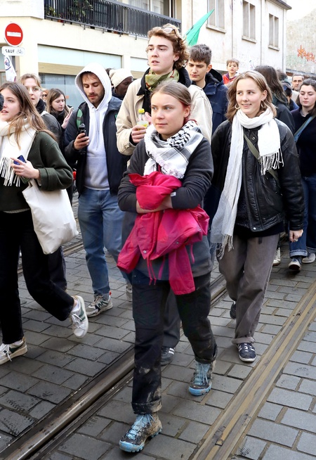 Greta Thunberg, symbol mondial de la lutte contre le rechauffement climatique participe à une manifestation contre un projet de forage de huit puits de petrole dans la forêt de La Teste sur le bassin d'Arcachon, le 11 Fevrier 2024 à Bordeaux. Patrick Bernard/ Bestimage Greta Thunberg, world symbol of the fight against global warming, takes part in a demonstration against a project to drill eight oil wells in the La Teste forest in the Arcachon basin, on February 11, 2024 in Bordeaux