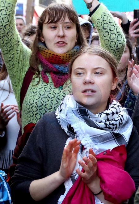 Greta Thunberg, symbol mondial de la lutte contre le rechauffement climatique participe à une manifestation contre un projet de forage de huit puits de petrole dans la forêt de La Teste sur le bassin d'Arcachon, le 11 Fevrier 2024 à Bordeaux. Patrick Bernard/ Bestimage Greta Thunberg, world symbol of the fight against global warming, takes part in a demonstration against a project to drill eight oil wells in the La Teste forest in the Arcachon basin, on February 11, 2024 in Bordeaux