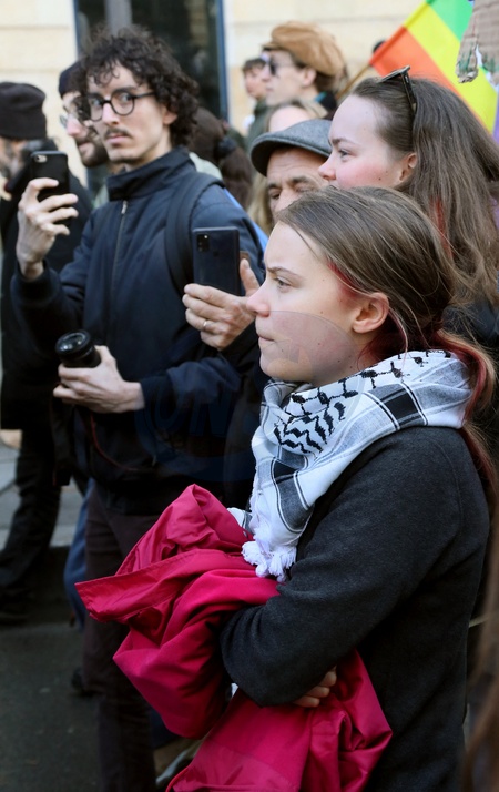 Greta Thunberg, symbol mondial de la lutte contre le rechauffement climatique participe à une manifestation contre un projet de forage de huit puits de petrole dans la forêt de La Teste sur le bassin d'Arcachon, le 11 Fevrier 2024 à Bordeaux. Patrick Bernard/ Bestimage Greta Thunberg, world symbol of the fight against global warming, takes part in a demonstration against a project to drill eight oil wells in the La Teste forest in the Arcachon basin, on February 11, 2024 in Bordeaux