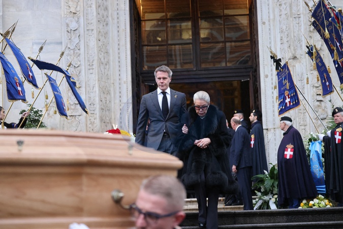 Le prince Emmanuel-Philibert de Savoie et sa mère Marina Ricolfi-Doria - Sorties des funérailles du prince Victor Emmanuel de Savoie en la cathédrale Saint-Jean-Baptiste de Turin le 10 février 2024. © Dominique Jacovides/Bestimage Exits from the funeral of Prince Victor Emmanuel of Savoy in the Cathedral of Saint John the Baptist in Turin on February 10, 2024.
