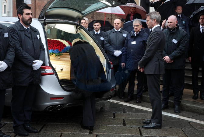 Le prince Emmanuel-Philibert de Savoie et sa mère Marina Ricolfi-Doria - Sorties des funérailles du prince Victor Emmanuel de Savoie en la cathédrale Saint-Jean-Baptiste de Turin le 10 février 2024. © Dominique Jacovides/Bestimage Exits from the funeral of Prince Victor Emmanuel of Savoy in the Cathedral of Saint John the Baptist in Turin on February 10, 2024.