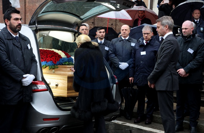 Le prince Emmanuel-Philibert de Savoie et sa mère Marina Ricolfi-Doria - Sorties des funérailles du prince Victor Emmanuel de Savoie en la cathédrale Saint-Jean-Baptiste de Turin le 10 février 2024. © Dominique Jacovides/Bestimage Exits from the funeral of Prince Victor Emmanuel of Savoy in the Cathedral of Saint John the Baptist in Turin on February 10, 2024.