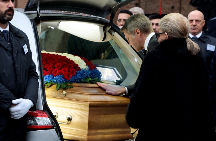 Le prince Emmanuel-Philibert de Savoie et sa mère Marina Ricolfi-Doria - Sorties des funérailles du prince Victor Emmanuel de Savoie en la cathédrale Saint-Jean-Baptiste de Turin le 10 février 2024. © Dominique Jacovides/Bestimage Exits from the funeral of Prince Victor Emmanuel of Savoy in the Cathedral of Saint John the Baptist in Turin on February 10, 2024.