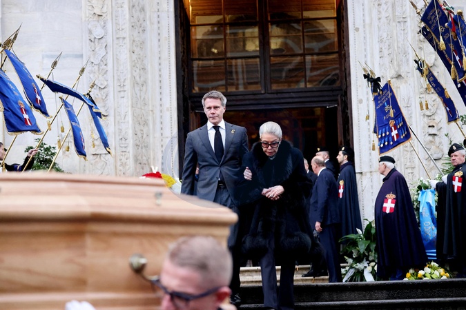Le prince Emmanuel-Philibert de Savoie et sa mère Marina Ricolfi-Doria - Sorties des funérailles du prince Victor Emmanuel de Savoie en la cathédrale Saint-Jean-Baptiste de Turin le 10 février 2024. © Dominique Jacovides/Bestimage Exits from the funeral of Prince Victor Emmanuel of Savoy in the Cathedral of Saint John the Baptist in Turin on February 10, 2024.