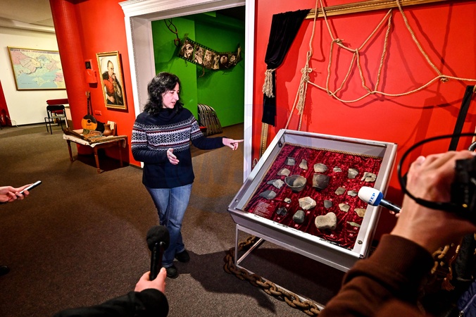 ZAPORIZHZHIA, UKRAINE - FEBRUARY 09, 2024 - Senior researcher of the the Khortytsia National Reserve Polina Petrashyna demonstrates the archaeological finds discovered after the shallowing of the Kakhovka Reservoir as a result of the dam explosion by Russian troops, Zaporizhzhia, south-eastern Ukraine., Credit:Dmytro Smolienko / Avalon