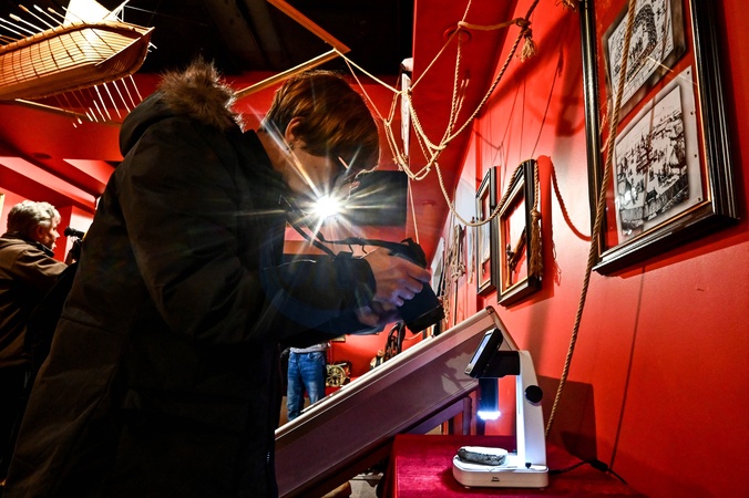 ZAPORIZHZHIA, UKRAINE - FEBRUARY 09, 2024 - A woman takes pictures of the archaeological finds discovered after the shallowing of the Kakhovka Reservoir as a result of the dam explosion by Russian troops, exhibited at the museum of the Khortytsia National Reserve, Zaporizhzhia, south-eastern Ukraine., Credit:Dmytro Smolienko / Avalon