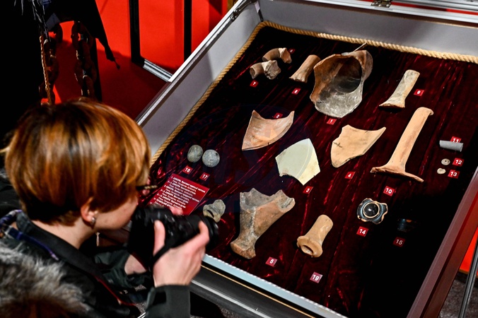 ZAPORIZHZHIA, UKRAINE - FEBRUARY 09, 2024 - A woman takes pictures of the archaeological finds discovered after the shallowing of the Kakhovka Reservoir as a result of the dam explosion by Russian troops, exhibited at the museum of the Khortytsia National Reserve, Zaporizhzhia, south-eastern Ukraine., Credit:Dmytro Smolienko / Avalon
