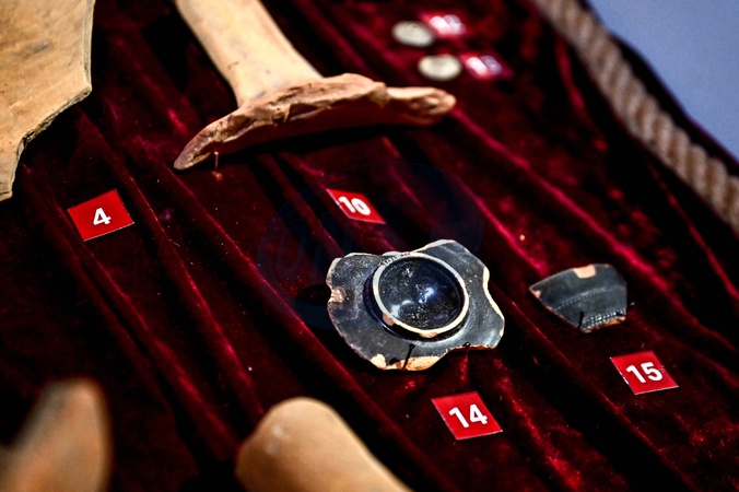 ZAPORIZHZHIA, UKRAINE - FEBRUARY 09, 2024 - Archaeological finds discovered after the shallowing of the Kakhovka Reservoir as a result of the dam explosion by Russian troops, exhibited at the museum of the Khortytsia National Reserve, Zaporizhzhia, south-eastern Ukraine., Credit:Dmytro Smolienko / Avalon