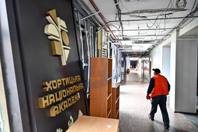 ZAPORIZHZHIA, UKRAINE - FEBRUARY 9, 2024 - Volunteers of the Dobrobat NGO, a volunteer construction battalion that assists the survivors in the de-occupied territories in the urgent restoration of housing and social infrastructure, repair the Khortytsia National Academy damaged in Russian shelling, Zaporizhzhia, southeastern Ukraine., Credit:Dmytro Smolienko / Avalon