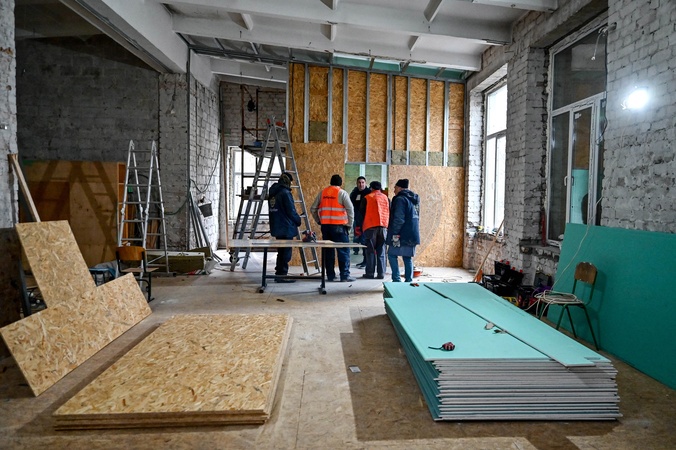 ZAPORIZHZHIA, UKRAINE - FEBRUARY 9, 2024 - Volunteers of the Dobrobat NGO, a volunteer construction battalion that assists the survivors in the de-occupied territories in the urgent restoration of housing and social infrastructure, repair the Khortytsia National Academy damaged in Russian shelling, Zaporizhzhia, southeastern Ukraine., Credit:Dmytro Smolienko / Avalon