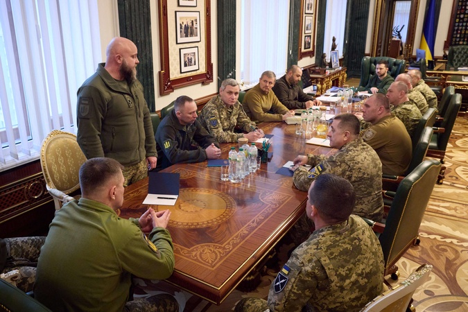 Le président ukrainien Volodymyr Zelensky rencontre les dirigeants militaires ukrainiens au palais présidentiel de Mariinsky à Kiev