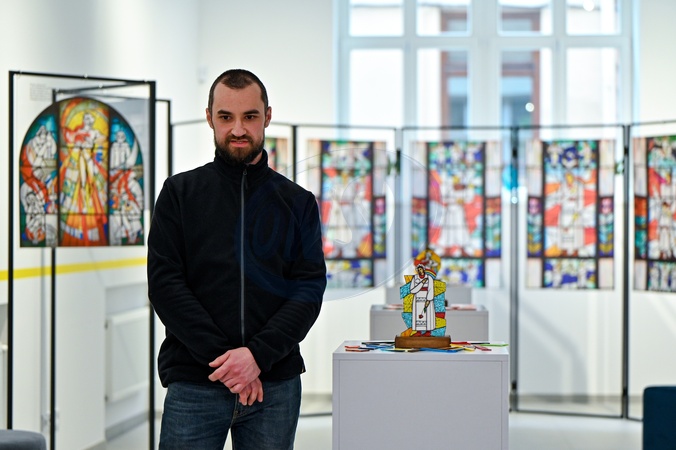 LVIV, UKRAINE - FEBRUARY 10, 2024 - Mariupol journalist and researcher of the crimes committed by Russia against Ukrainians Ivan Stanislavskyi attends his Careful Fragile! exhibition at the Mariupol Reborn office in Lviv, western Ukraine. The exhibition scheduled for March 2022 in Mariupol was cancelled due to Russia's full-scale war against Ukraine and the shelling of the city. The project is a collection of photographs of stained glass windows captured by Ivan Stanislavskyi across his native Mariupol in 2019-2021. These stained glass windows are likely lost as the buildings where these creations were located are destroyed as investigated by Ivan Stanislavskyi., Credit:Anastasiia Smolienko / Avalon