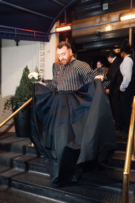 Sam Smith à la sortie du défilé de son compagnon Christian Cowan Automne/Hiver 2024-2025 lors de la Fashion Week de New York (NYCFW), à New York City, New York, Etats-Unis, le 11 février 2024. © Tiziano Da Silva/Bestimage Celebs is seen arriving at the Christian Cowan F/W24 Fashion Show on February 11, 2024 in New York Cit