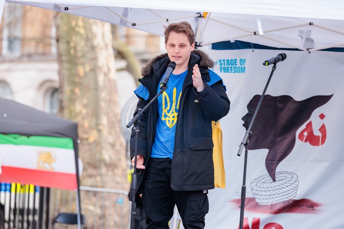 Whitehall, London, UK. 11th February 2024.Pavlo Domitrashchuk, Ukrainian Human Rights activist, speaks at a Stage of Freedom event where British Iranian diaspora and supporters protest the regime on the 45th anniversary of the 1979 Revolution.The majority of Iranians consider the Islamic Revolutionary Guard Corps (IRGC), who have a role in nearly every aspect of Iranian politics and society, as an obstacle to the life they want to live. Many also view the IRGC a terrorist organisation due to it's brutal and repressive conduct and financing of terrorism abroad and are calling for a free and democratic Iran., Credit:Photo by Amanda Rose / Avalon