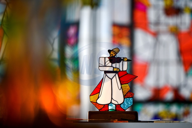 LVIV, UKRAINE - FEBRUARY 10, 2024 - A stained glass creation is showcased at the Careful Fragile! exhibition featuring the photo project of Mariupol journalist and researcher of the crimes committed by Russia against Ukrainians Ivan Stanislavskyi at the Mariupol Reborn office in Lviv, western Ukraine. The exhibition scheduled for March 2022 in Mariupol was cancelled due to Russia's full-scale war against Ukraine and the shelling of the city. The project is a collection of photographs of stained glass windows captured by Ivan Stanislavskyi across his native Mariupol in 2019-2021. These stained glass windows are likely lost as the buildings where these creations were located are destroyed as investigated by Ivan Stanislavskyi., Credit:Anastasiia Smolienko / Avalon