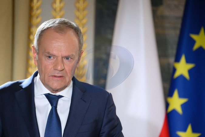 Le président de la République française Emmanuel Macron et le Premier ministre polonais Donald Tusk lors d'une conférence de presse commune au palais présidentiel de l'Elysée à Paris