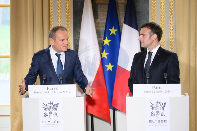 Le président de la République française Emmanuel Macron et le Premier ministre polonais Donald Tusk lors d'une conférence de presse commune au palais présidentiel de l'Elysée à Paris, France, le 12 février 2024. © Jacques Witt/Pool/Bestimage Donald Dusk and Emmanuel Macron. French President Emmanuel Macron and Polish Prime Minister Donald Tusk during a press conference at Elysee Palace, in Paris, France, on February 12, 2024.